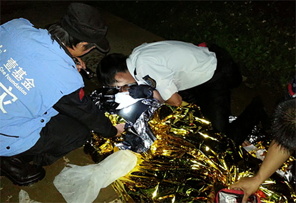 2013年08月16日晚,救援隊在排查海埂時發現有人漂浮在水面,立即展開了救援行動并撥打120急救電話。發現傷員呼吸微弱、體溫下降的情況下,使用CROR急救包中的急救毯將傷員全身包裹,同時進行了心肺復蘇搶救,成功挽救了一條生命。